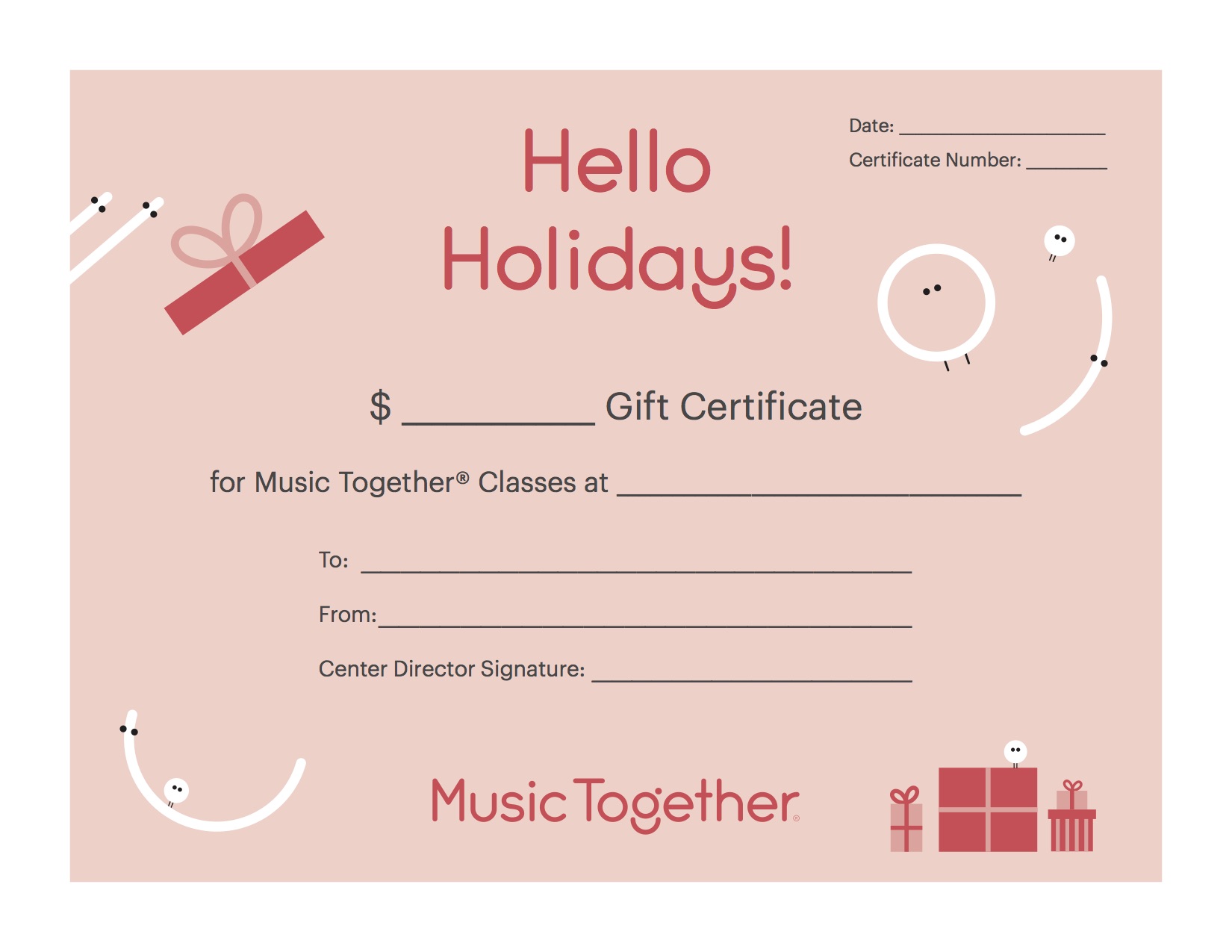 This gift certificate covers one full 10-week session for a family with one child that has been enrolled in Music Together® classes before at Bebop & Bundles. Enrollment in our 10-week sessions include: weekly 45-minute class, our take-home family materials (current session collection: 2 CDs (one for home one for the car), an illustrated songbook, and additional support materials on our Music Together App, Hello Everybody.)